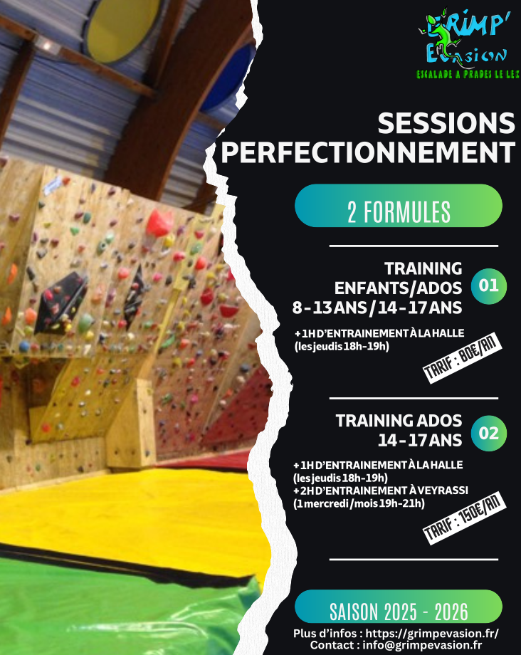 Ces séances, à thèmes, vous permettront de progresser. Elles sont préparées et encadrées par Cyrielle, monitrice d'escalade. La première séance sera axée sur la technique (placement et pose des pieds) et sur le travail de la "conti" (volume), histoire de bien démarrer la nouvelle saison.